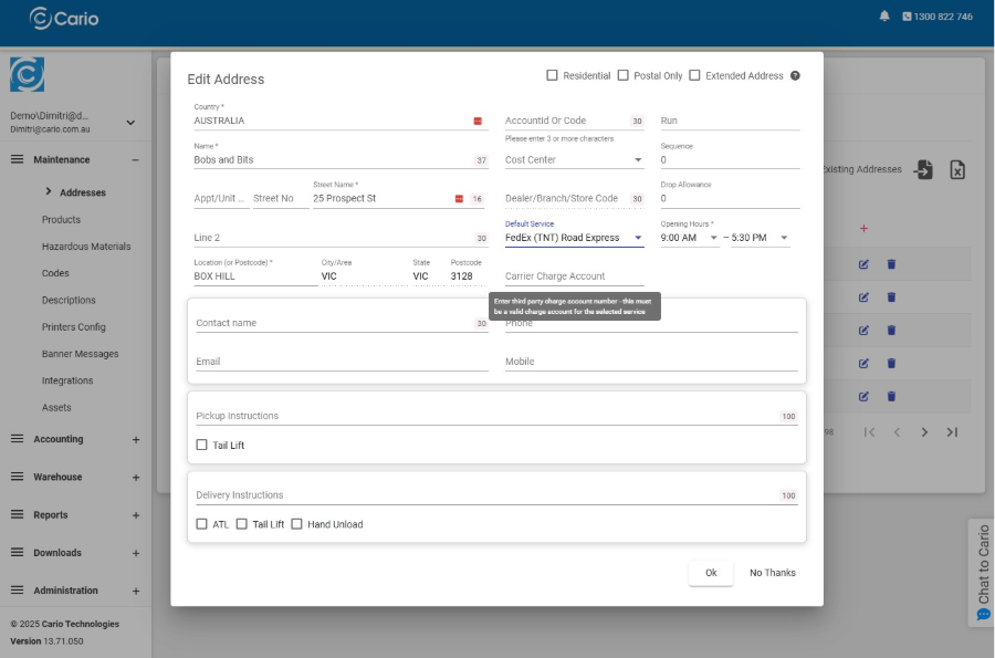 To streamline future consignments, carrier charge accounts can be saved at an address level.