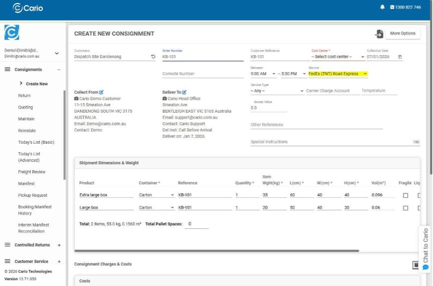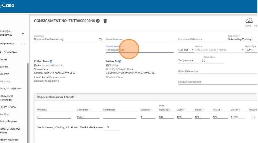 Instead of manually entering shipment details, users can simply enter an order number, and Cario will automatically populate the consignment with the relevant information.