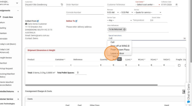 References and Special Instructions in Cario allow users to add structured, reusable information to consignments, improving consistency, accuracy, and speed during booking.