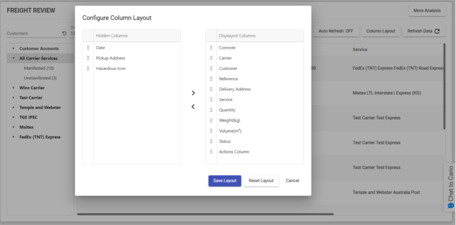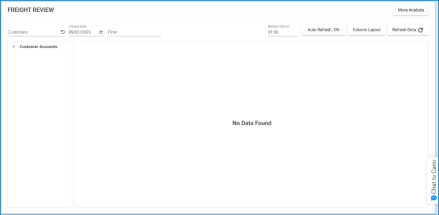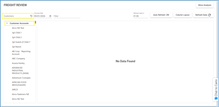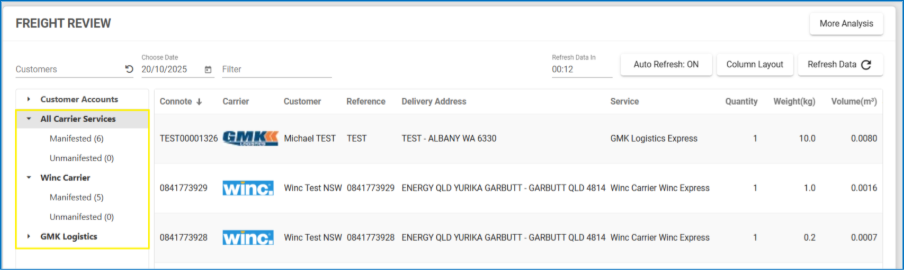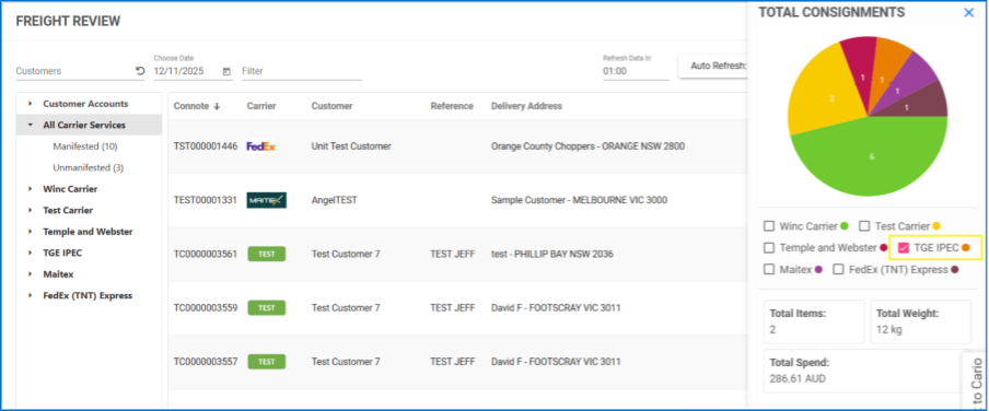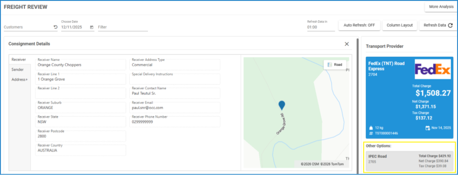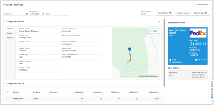 The Freight Review screen provides a centralised analytics view of consignments based on a selected date and customer. It allows users to analyse freight activity, review carrier performance, monitor spend, and access detailed consignment and transport provider information — all from a single screen.