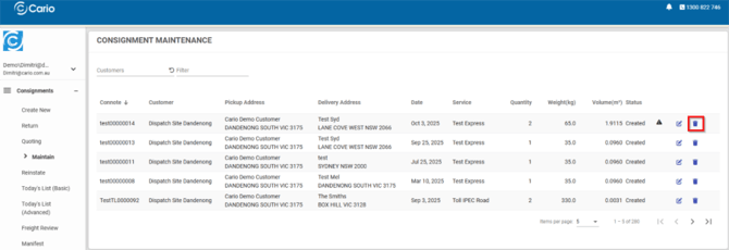 (you can search or filter if required) - Click the trash bin icon next to the consignment