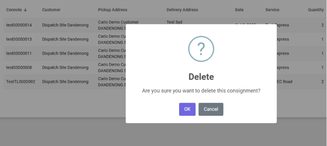 Deleting a consignment in Cario allows users to permanently remove consignments that were created in error or are no longer required.