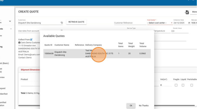 - Select a quote from the available saved quotes list