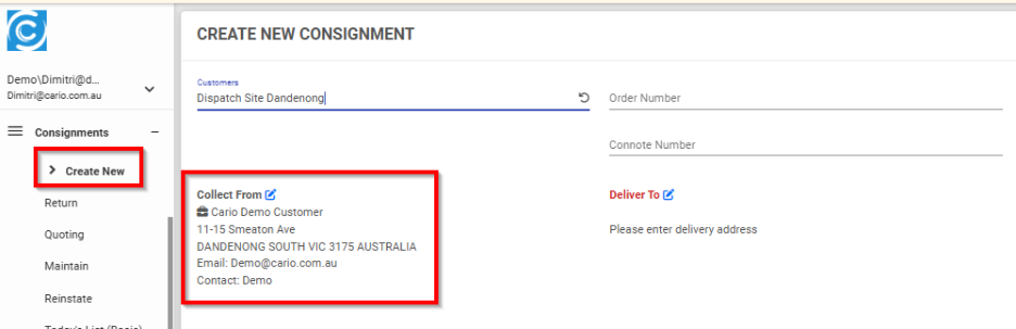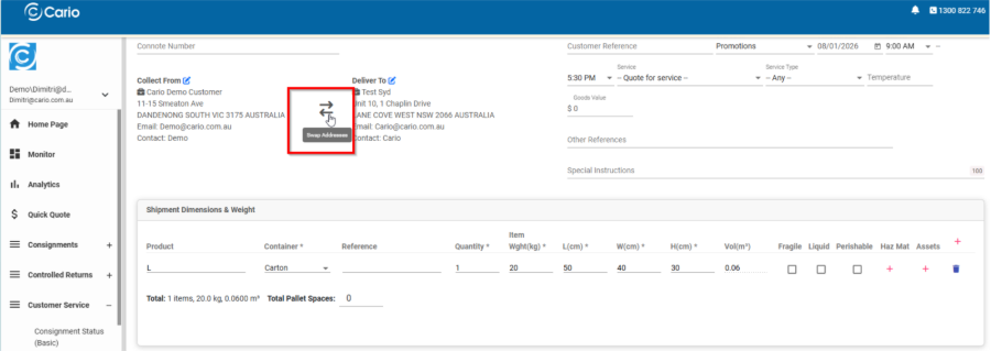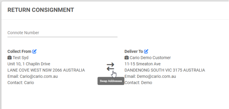 The Return function in Cario allows users to quickly create a return shipment using the same workflow as creating a new consignment, with one key difference: