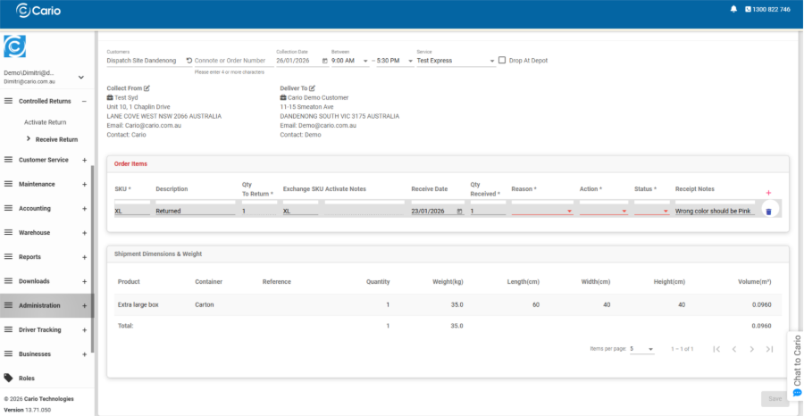1. Locate the Return- Use the Connote Number or Order Number to search for the activated return.