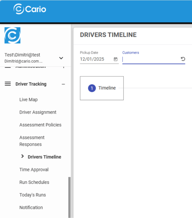 The Drivers Timeline screen in Cario Connect TMS provides visibility into a driver’s daily activity, movement, and time-based events, captured directly from the Cario Connect mobile app.