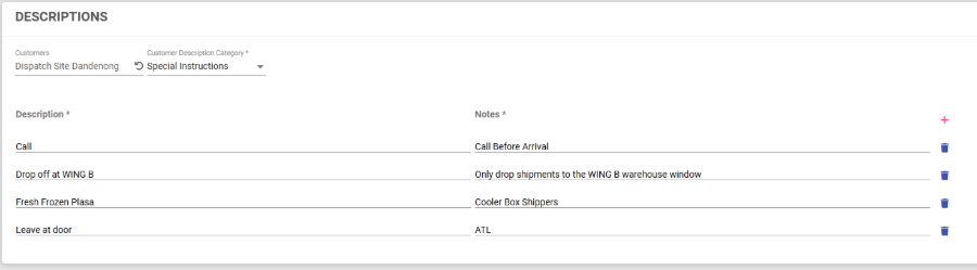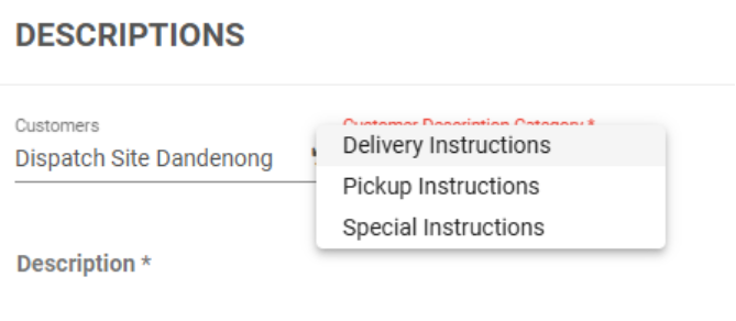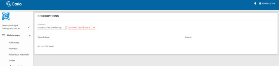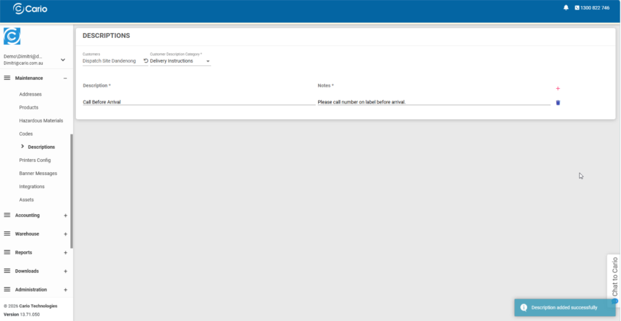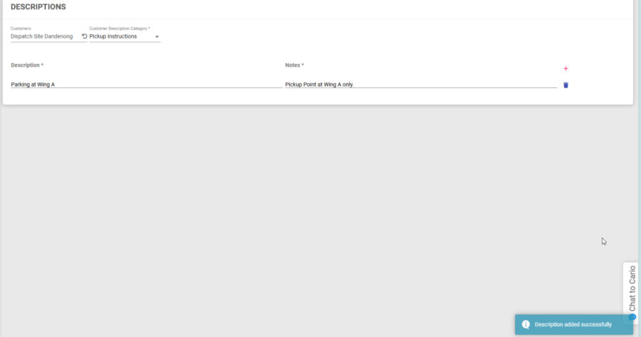 The Descriptions feature in Cario allows you to predefine commonly used delivery, pickup, and special instructions. These predefined descriptions can then be quickly selected when creating consignments, helping ensure consistency, accuracy, and faster booking workflows.