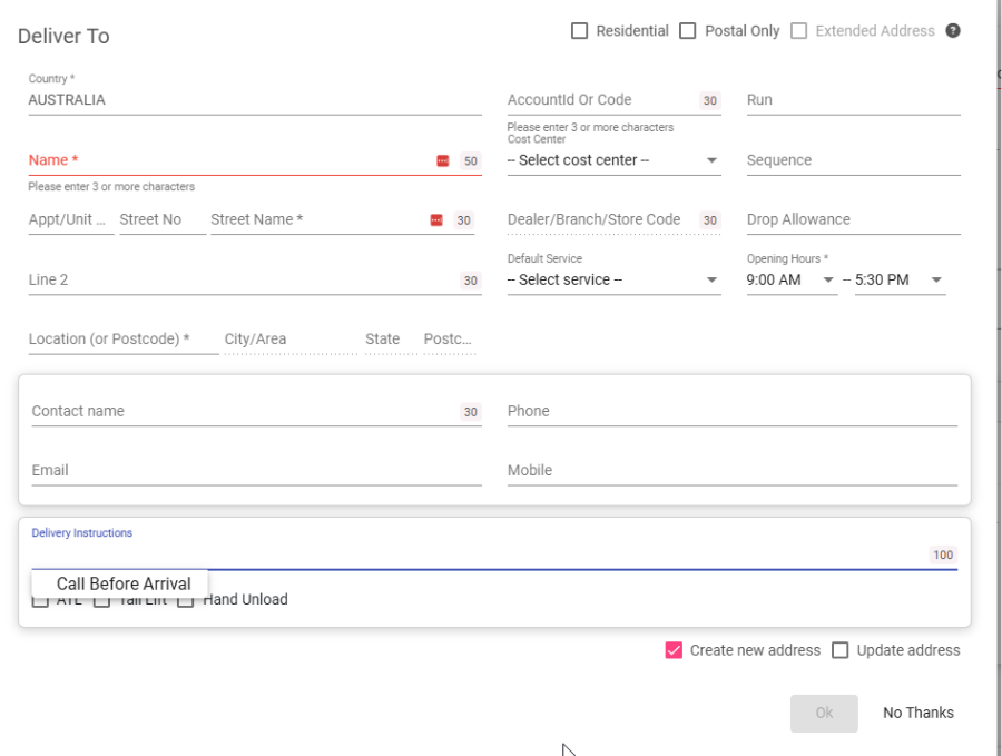 - When creating a new consignment, the Special Instructions field will display a dropdown of all predefined special instructions for that customer.