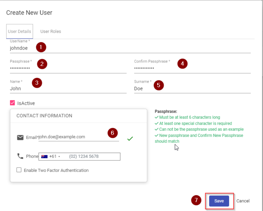 When the user creation screen opens, enter the user details exactly as provided by the customer. These details typically include: