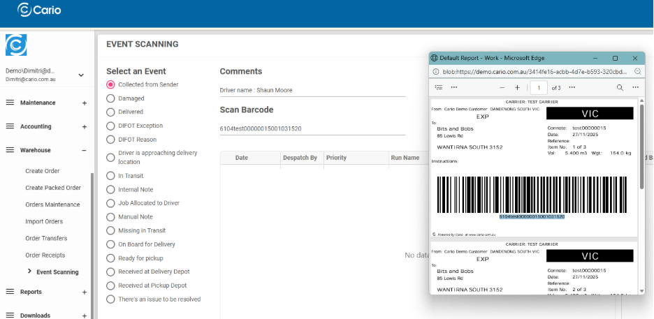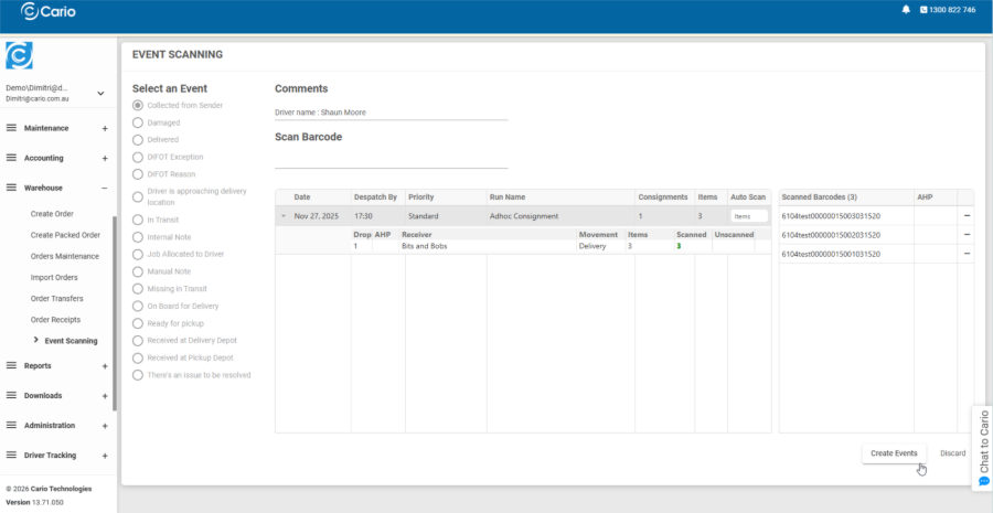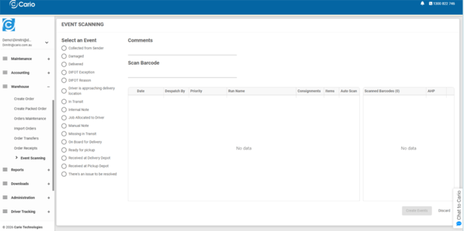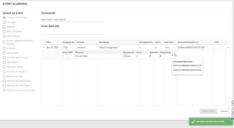 The Event Scanning feature allows warehouse and operations teams to scan item barcodes and update consignment status milestones in real time. This ensures accurate tracking, visibility, and auditability of freight as it moves through each stage of the delivery lifecycle.