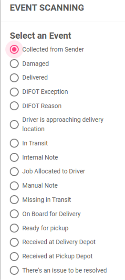 From the Select an Event panel on the left-hand side, choose the appropriate event that reflects the current status of the freight (e.g. Collected from Sender, Delivered, In Transit).