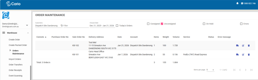 The Order Maintenance screen is the central workspace for managing warehouse orders before they become consignments.