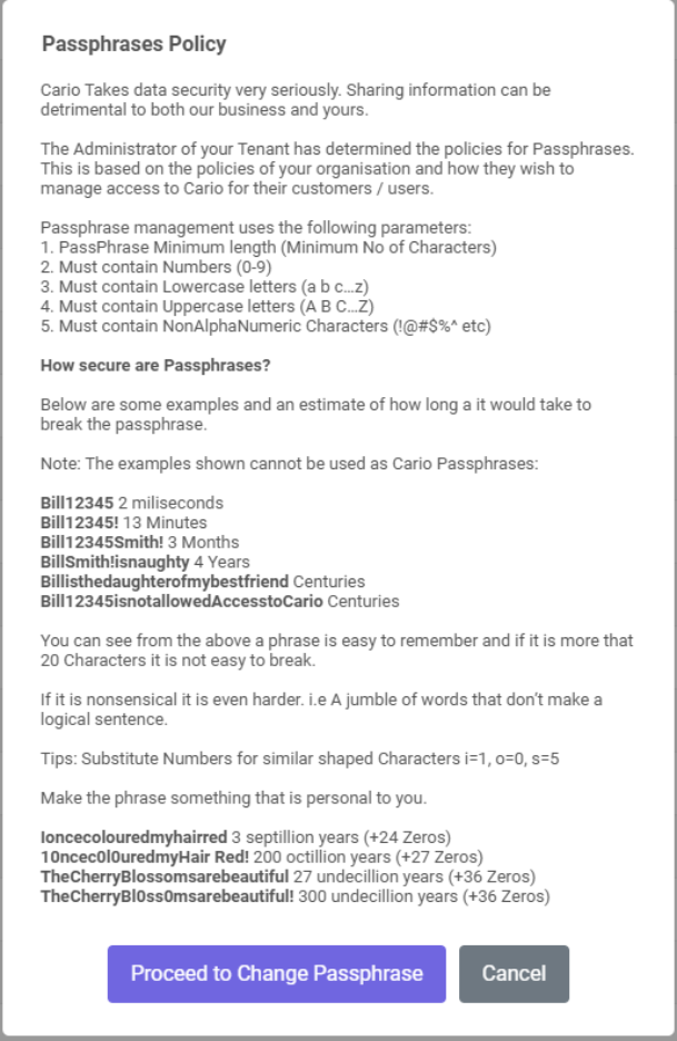 Cario enforces secure passphrase standards, which may include: